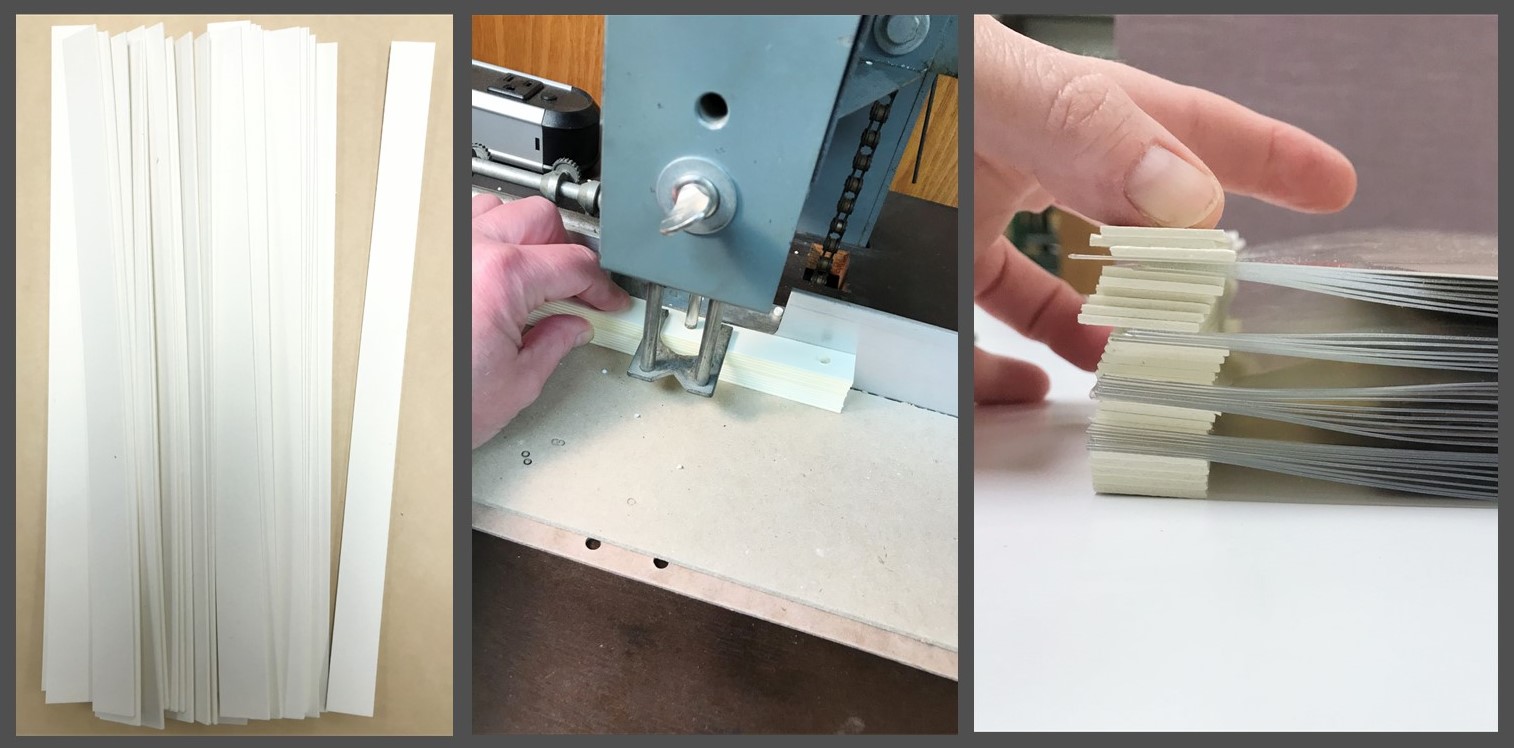 Left: Spacers cut from museum board, Center: Drilling holes with the drill press, and Right: A preview of the spacers between the pages |